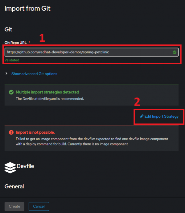 In this case, the source code contains a development configuration file (devfile) that is outdated, causing the error. You need to override this by clicking on the Edit Import Strategy link (Figure 2, Callout 2).