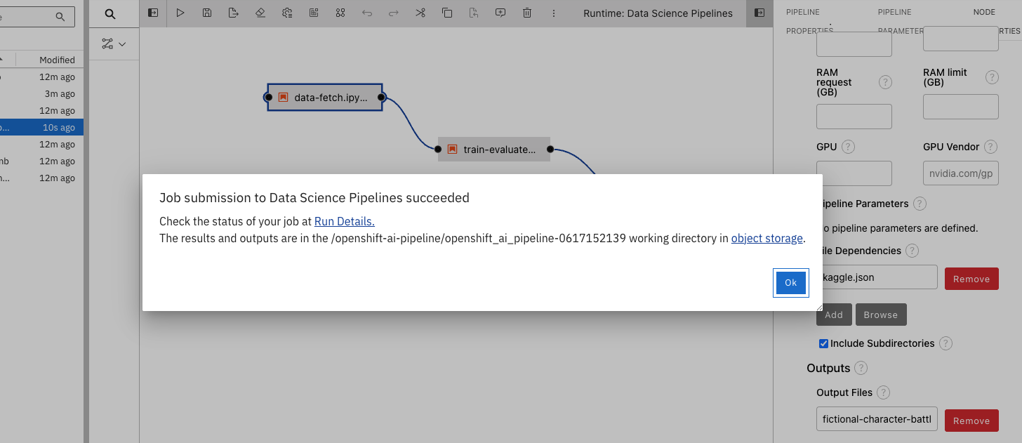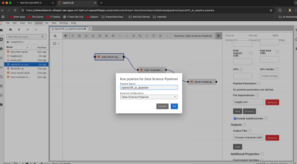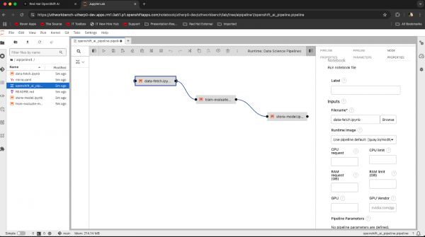 openshift_ai_pip…. This is the pipeline file, and the workbench image we are using supports visual interaction with these Pipelines and uses the Pipeline Server we have created, tied to the S3 storage, for execution.Double-click on the pipeline to see it in the visualizer.