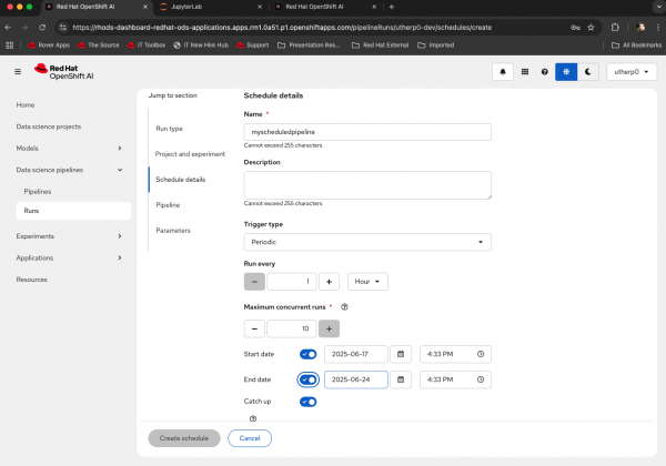 Figure 10: Select scheduling options for AI pipelines in OpenShift AI. The options that appear allow you to set the pipeline up like a CRON job, giving a frequency, days to run between, and other date-specific options. This dialog box also gives you a huge amount of automated options for the repeated execution of the experiment via the pipeline.