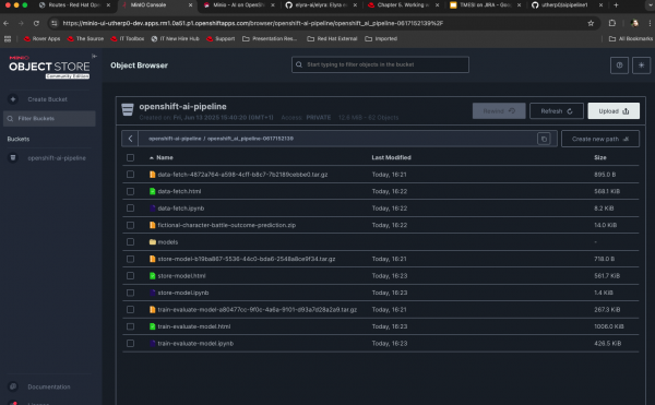 Click on this and look at the files in the bucket; the pipeline has written all of the training sets and the results into the bucket.
