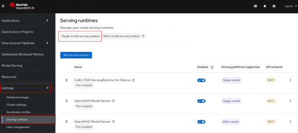 occommands to enable the Single Model Serving runtime for OpenShift AI:oc apply -k ./components/model-server/components-servingIt will take around 5 to 10 minutes for the changes to be applied.