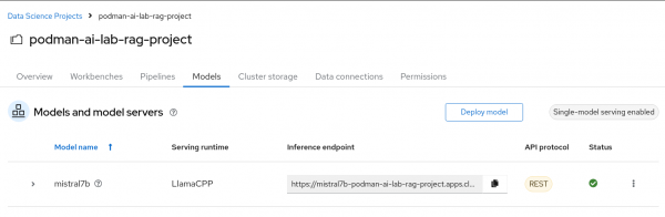 Go to your "podman-ai-lab-rag-project" and select Models. You should see two model serving type options. Select Deploy model under the Single-model serving platform (Figure 14).