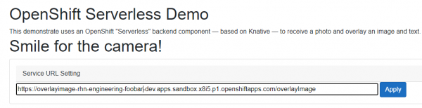 quay.io/rhdevelopers/image-overlay. - Write the front end in another language. Use a server-based web engine where it reads the URL from an environment variable so it doesn’t need to be entered on the screen.