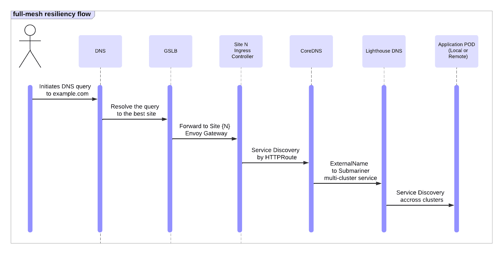 This orchestrated flow ensures traffic reaches a healthy application instance, whether local or remote, transparently to the end user and application logic.