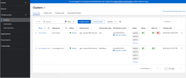 ```Verify that you see the vb-managed-cls-1 cluster in the cluster UI on Hub 2, with a status of Ready, as shown in Figure 1.