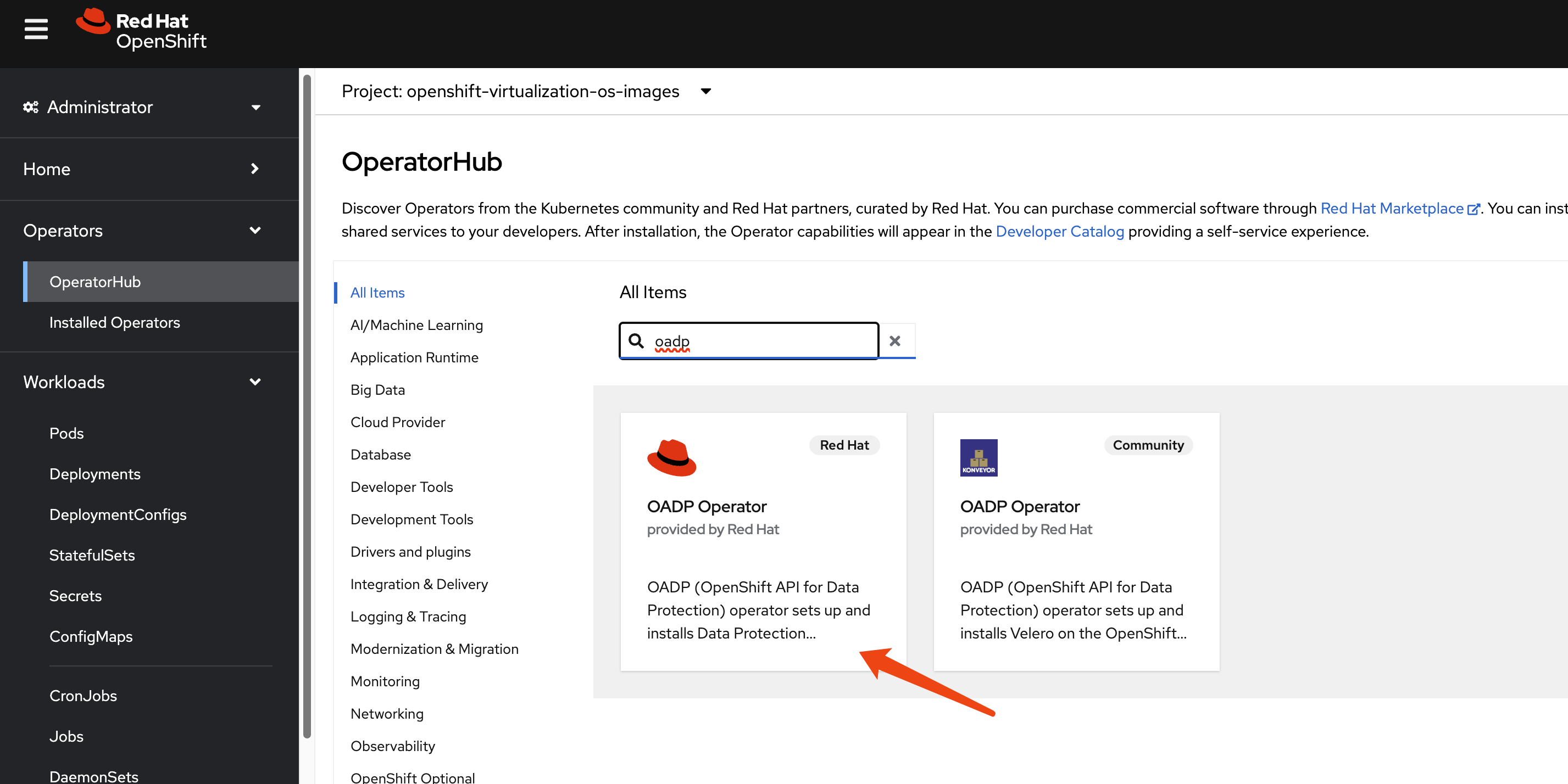 We use the OADP operator for metadata backup and restore. Install the OADP operator on both the primary (cluster-01) and DR (cluster-02) clusters (Figure 2).