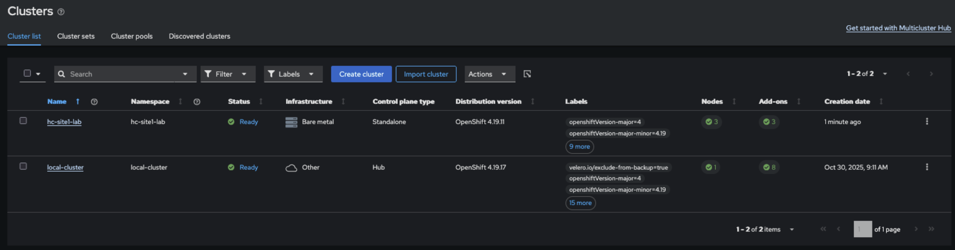 hc-site1-lab true https://api.xxx.example.com:6443 True True 31m <--- MCE CLUSTERImportant