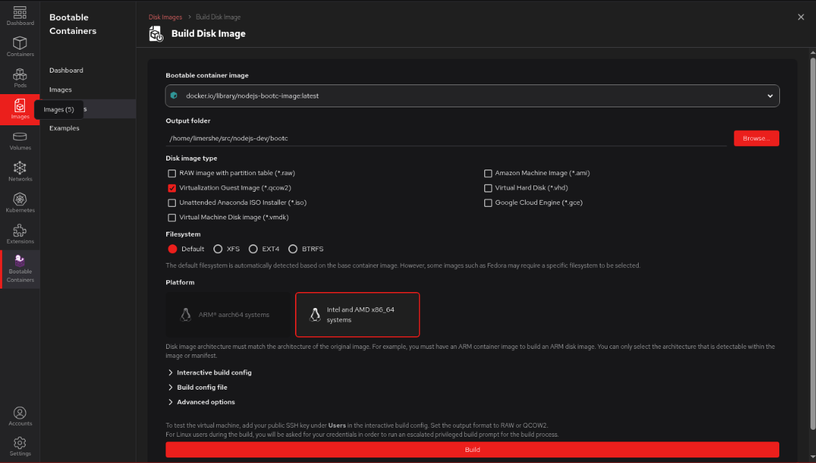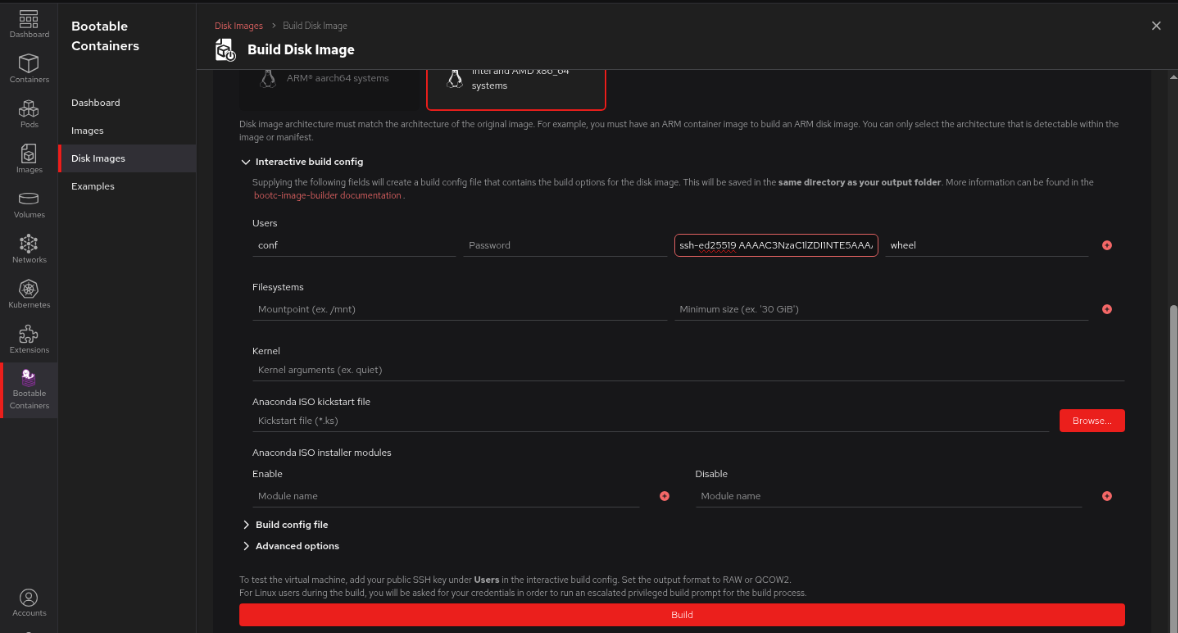 Figure 8: The expanded interactive build config section for building a disk image in Podman Desktop. - Select Build.