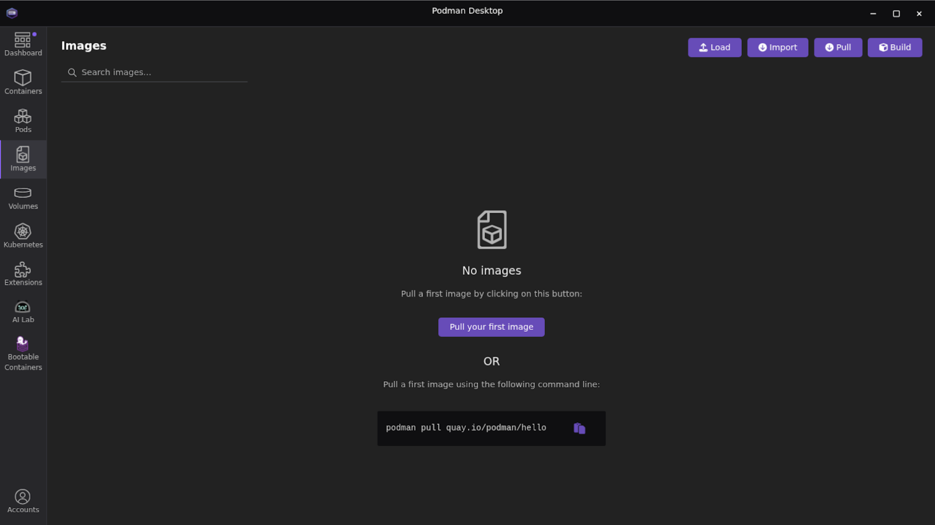 dotnet-dev/bootc/appon your local desktop using your preferred native desktop tools. We’ll use this directory as the central repository for our application files. You’ll be able to edit files either using the editors in your container, your favorite desktop text editor, or your IDE. Either way, they will be accessible from your container. Open Podman Desktop on your local machine and go to the Images section in the left navigation (Figure 1).