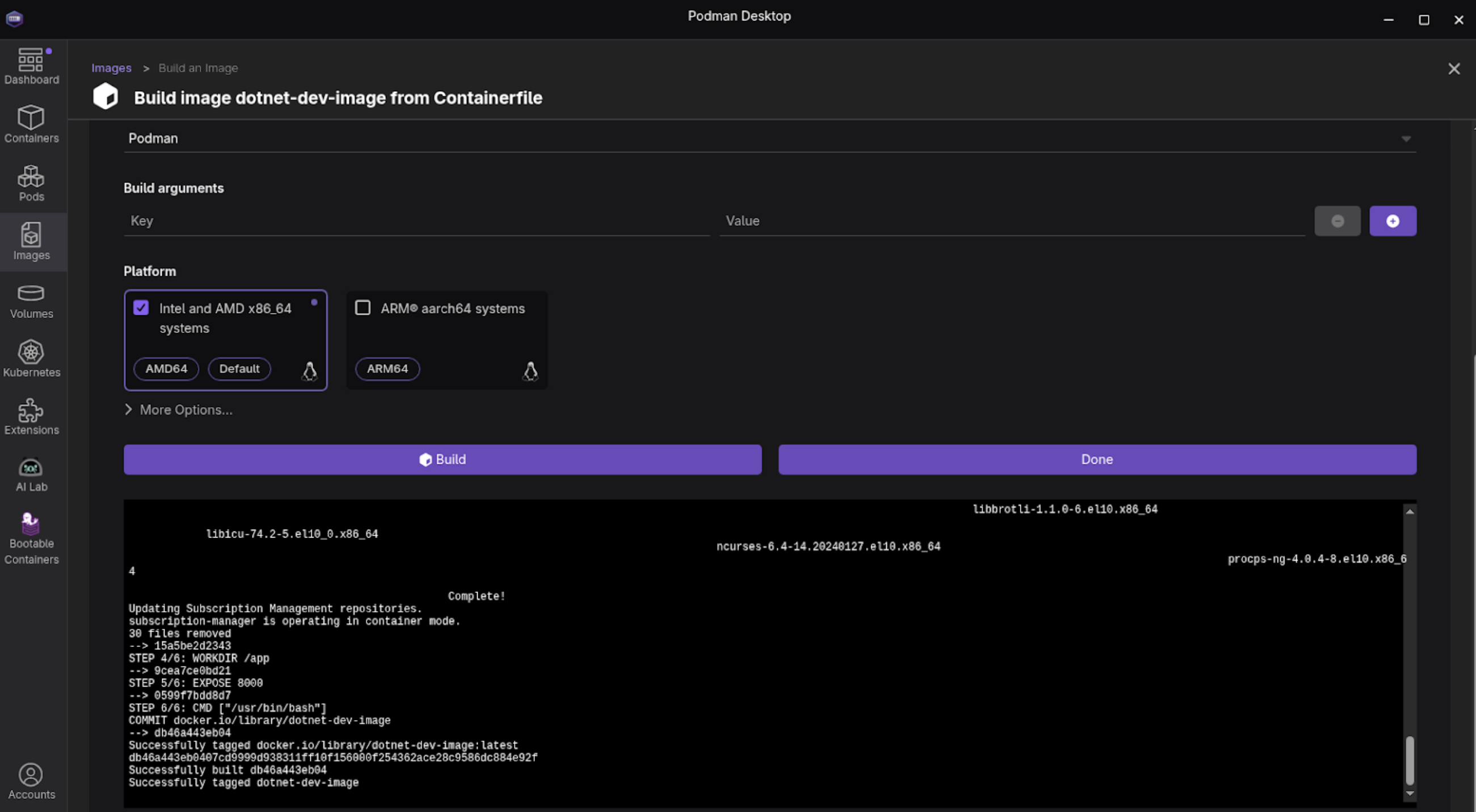 Figure 2: Podman Desktop Build screen. Now select Build at the bottom. It will build your new image. Select Done (Figure 3).