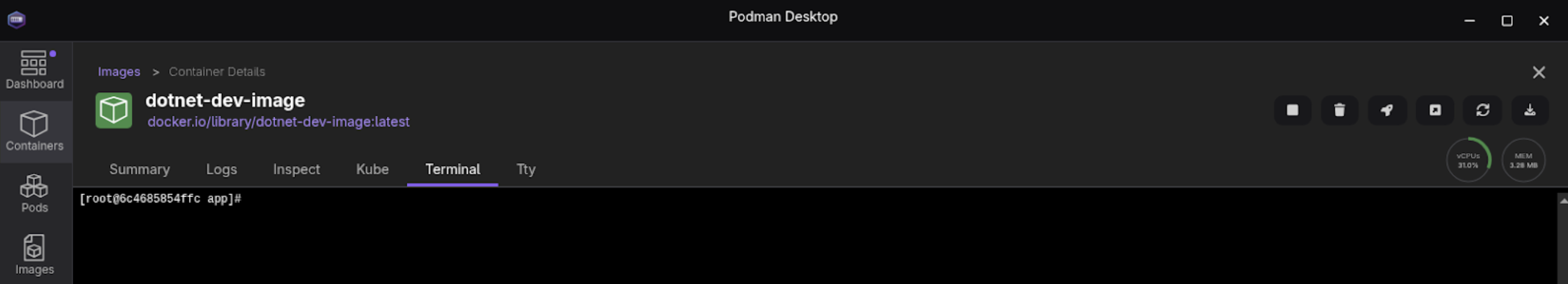 Figure 7: Podman Desktop Container Details screen. We start off .NET projects by creating a project. In this case, it's one focused on building a minimal web application. From the Podman Desktop terminal, make sure you are in the