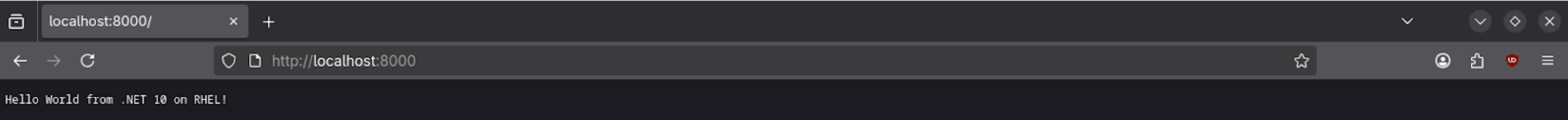 localhost. We instead explicitly tell it to bind to* (any network)by editing it to match the following content:// Program.cs var builder = WebApplication.CreateBuilder(args); // ADD THIS LINE: builder.WebHost.UseUrls("http://*:8000"); var app = builder.Build(); app.MapGet("/", () => "Hello World from .NET 10 on RHEL!"); app.Run();We’re now ready to compile the application and publish the release. We will copy this published output, not the source code, so that it’s ready to be deployed as a bootable application container using RHEL image mode.