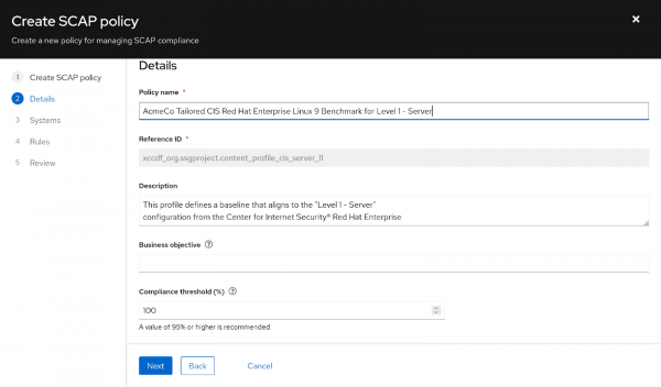 All Red Hat Enterprise Linux security compliance scanning and remediation is underpinned by content from the OpenSCAP project. OpenSCAP provides a mature and well-supported method for assessing, reporting, and enforcing security compliance at scale. For this guide, I will use the CIS Red Hat Enterprise Linux 9 Benchmark for Level 1 - Server policy and customize it according to my requirements.