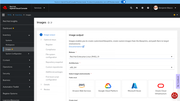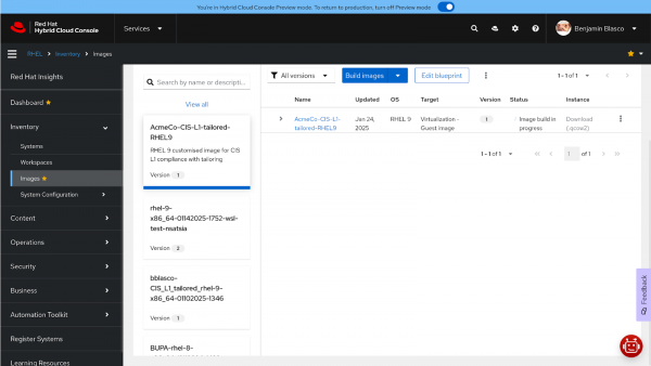 - Navigate to Red Hat Lightspeed for RHEL -> Inventory -> lmages (or go straight here: https://console.redhat.com/insights/image-builder).