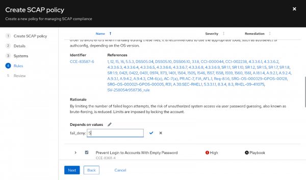 Figure 2: Associate your policy with an existing system. Here's where it gets interesting. Select which individual rules to exclude from the policy and customize parameters for rules that will remain included. OpenSCAP refers to this as tailoring. In this example, I will change the value for "Lock Accounts After Failed Password Attempts" (CCE-83587-6) from 3 failed log on attempts to 5 because I am a sloppy typist and want to cut myself some slack. (You probably don't want to do this in a real environment.) I will also exclude the rule "Disable Network File System (nfs)" (CCE-90850-9) to be able to use this system as an nfs server to share storage. Figures 3 and 4 depict this.