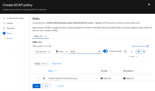 - Select CIS Red Hat Enterprise Linux 9 Benchmark for Level 1 - Server.