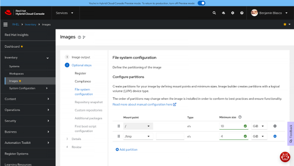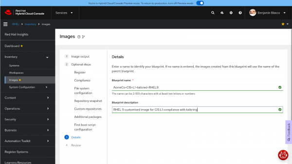 - Generate a customized hardened image with Red Hat Lightspeed image builder.