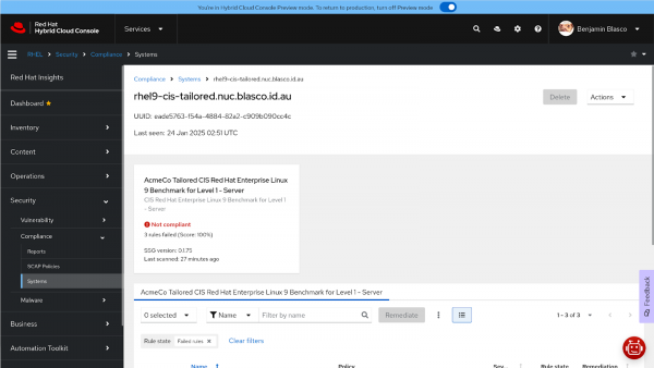 rhccommand-line interface (CLI) commands. If you aren't usingrhcalready, you should. It takes care ofsubscription-managerandinsights-clientregistration in one command. Ensure the host is registered and reporting to Red Hat Lightspeed:[root@rhel9-cis-tailored ~]# insights-client Starting to collect Insights data for rhel9-cis-tailored.nuc.blasco.id.au Writing RHSM facts to /etc/rhsm/facts/insights-client.facts ... Uploading Insights data. Successfully uploaded report from rhel9-cis-tailored.nuc.blasco.id.au to account 5471870. View details about this system on console.redhat.com: https://console.redhat.com/insights/inventory/eade5763-f54a-4884-82a2-c909b090cc4c [root@rhel9-cis-tailored ~]#Associate the host with the correct compliance policy. I did it with the CLI via the unique compliance ID. I like this because I can automate this with Ansible Automation Platform if I want to. Alternatively, I can do this directly via the Red Hat Lightspeed compliance service: