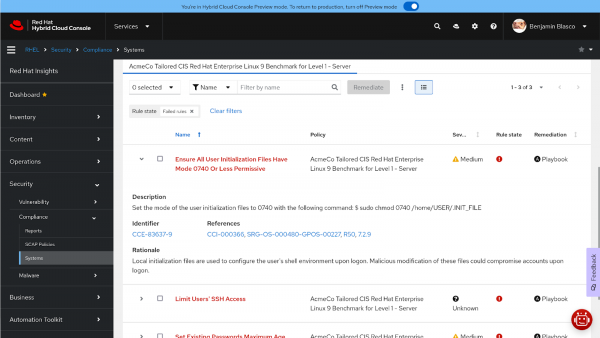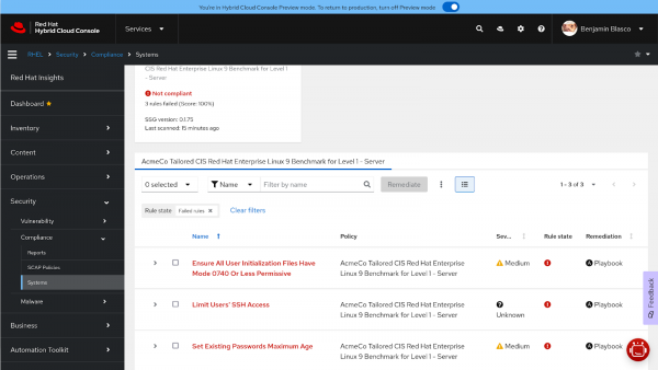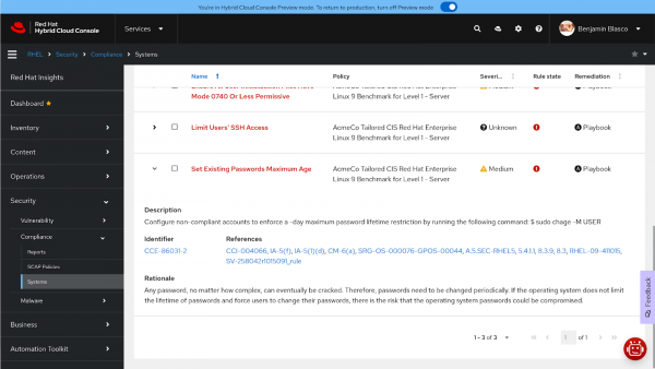 Once I assessed and understood the three compliance failures, I was able to make decisions about how to address those issues. I have one manual intervention to carry out and two Ansible Automation Platform remediations available to resolve the other two issues.
