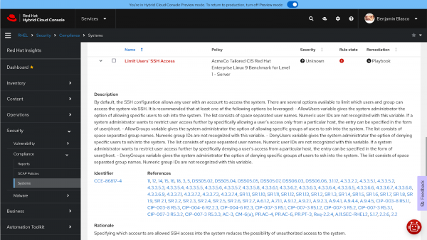 This check has Unknown severity and the remediation is manual (Figure 4). So I won't be able to take advantage of Ansible Automation Platform to remediate this issue.