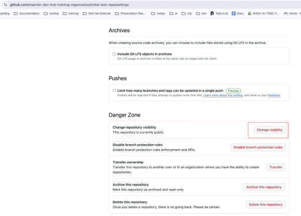 Figure 38: Change visibility of GitHub repository. The default CI infrastructure for GitHub is GitHub Actions. We will embed it in our demo application and make it available within Developer Hub. In order to do so, you will need to: