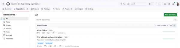 In the updated YAML, I added ‘added to enable software templates’ section to show which configuration was added. It is mainly a location reference and a rule to enable certain catalog entities in Developer Hub (of which Template is one). More on catalog entities in later training exercises. This configuration will make use of the GitHub integrations configuration to enable repository creation in GitHub. It can take a couple of minutes, depending on the processing interval you configured for the template to be imported. As described in the previous exercise, you can monitor this in the backstage_plugin_catalog database.