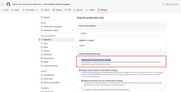 Figure 24: Change protection rules for GitHub repository. Uncheck "Require a pull request before merging".