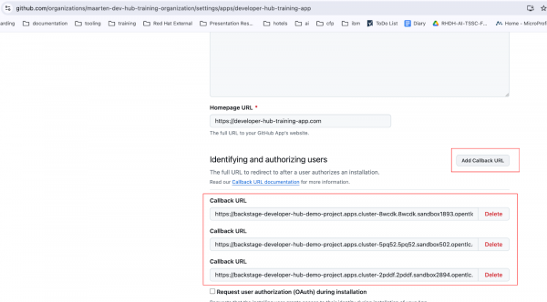 Figure 35: Review GitHub application settings. Scroll down in general to the callbacks section and check / edit / add your current domain.