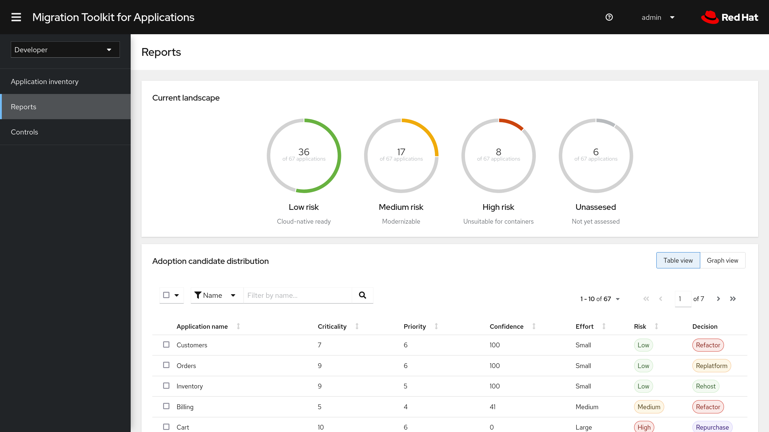 The MTA provides a central management interface that gives you a flexible, comprehensive view of your application portfolio, enabling you to evaluate its current state. To help you choose which applications to containerize and update with cloud-native technology, you can create application archetypes, which automatically group applications based on the criteria you define. You can also perform bulk assessment and automated source-code analysis to get both high-level and low-level insights that inform your modernization strategy and execution.